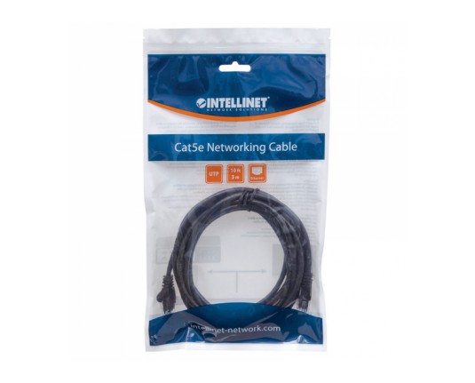 UTP kabel z nazivom INTELLINET CAT5e UTP 3m črn mrežni priključni patch kabel služi prenosu podatkov saj je Ethernet kabel - RJ45 kabel - UTP kabel je najpopularnejši kabel za protokol (prenos paketnih podatkov) v lokalnih omrežjih.