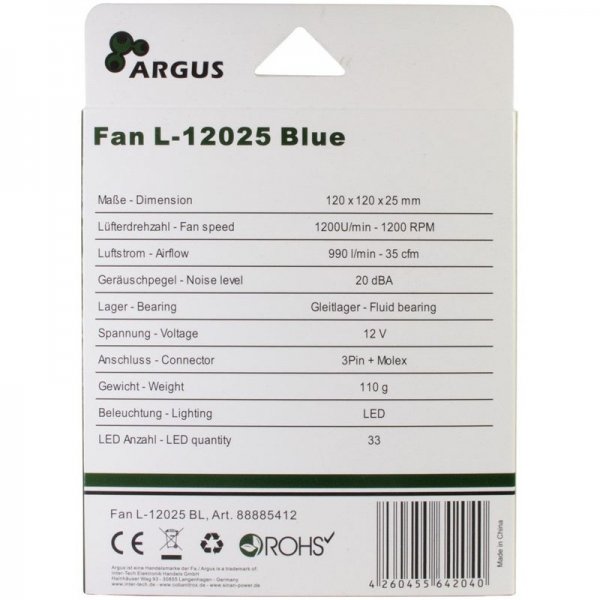 Dobro hlajenje namiznega računalnika izboljša življensko dobo vseh komponent, zato je velik INTER-TECH Argus L-12025 BL moder LED 120mm ventilator odlična izbira za vaše potrebe po kakovostnem hlajenju. Omogoča dober pretok zraka in nizke temperature obratovanja računalnika, hkrati pa zagotavlja tiho delovanje tudi pri težjih obremenitvah sistema. konektor poskrbi za povezavo z matično ploščo računalnika.