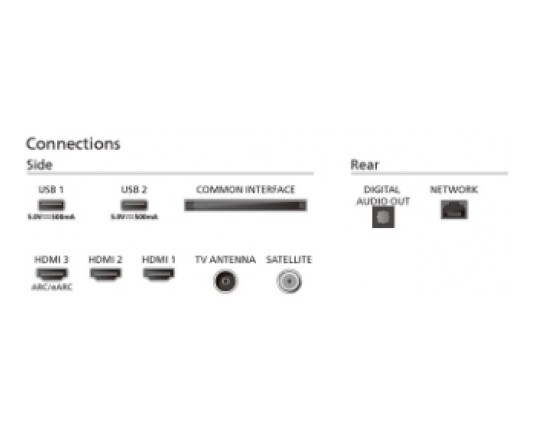 - Ostali priključki: Standardni vmesnik plus (CI+), Ethernet-LAN RJ-45, Digitalni avdio izhod (optični), Satelitski priključek, Storitveni priključek HDCP 2.3: Da za vse HDMI