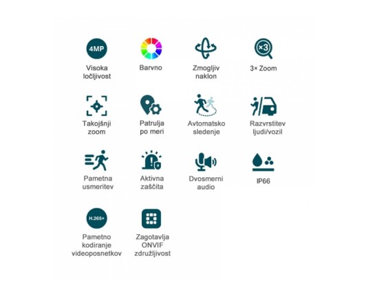 | Dodatno: | Pametne funkcije: Klasifikacija ljudi in vozil, zaznavanje vdorov v območje, zaznavanje prečkanja črte, zaznavanje ljudi, zaznavanje vozil, zaznavanje vstopa v regijo, zaznavanje izhoda iz regije, zaznavanje zapuščenega predmeta, zaznavanje odstranitve predmeta Osnovne funkcije: Zaznavanje gibanja, zaznavanje poseganja v video, izjema (nezakonita prijava) Povezava alarma: Snemanje videa na pomnilniško kartico, pošiljanje sporočil, zvočno opozorilo, utripajoča bela lučka |
