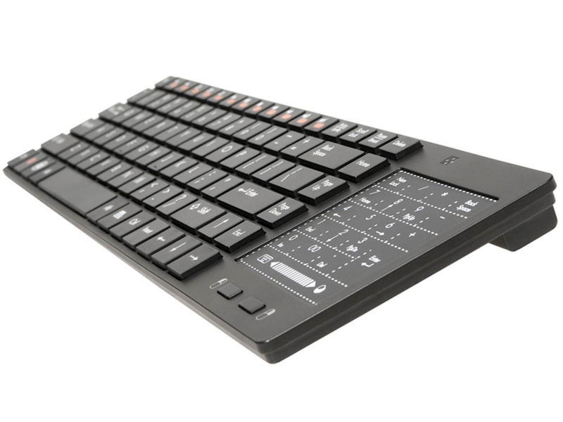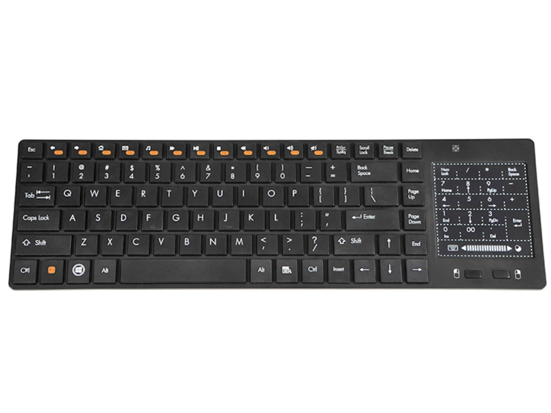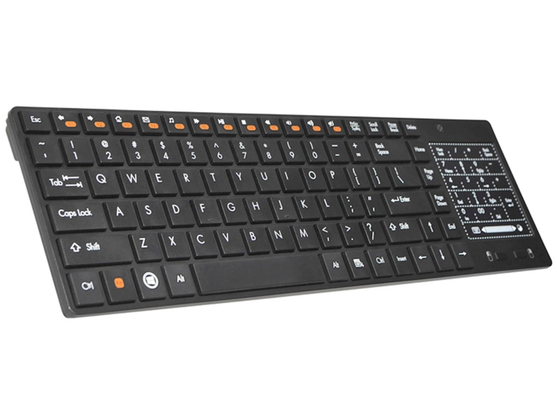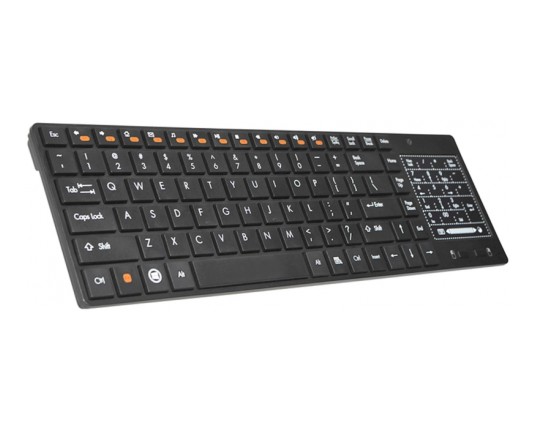Hiter dostop do glavnih funkcij Šest večpredstavnostnih tipk in vgrajena sledilna ploščica vam omogočajo veliko več v krajšem času. Smart RF tipkovnica izboljša udobje uporabe televizorjev, konzole za video igre, prenosnike in klasične osebne računalnike. Zahvaljujoč večpredstavnostnim tipkam omogoča takojšen dostop do glasbe, e-pošte in mnogih drugih funkcij. Kakovostna brezžična povezava v pasu 2,4 GHz Pišite, delajte in igrajte, kjer koli želite. Brezžična povezava 2,4 GHz odpravlja zamude, pade komunikacije in izkrivljanja v razdalji do 10 metrov. Eleganten in tanek dizajn omogoča, da se naprava zlije z vsako notranjostjo. Membranski mehanizem in nizki profil tipk zagotavljata udobno uporabo tudi pri delu z več vsebine. Zaradi nizkega profila tipk je pisanje ne samo udobno, ampak tudi zelo tiho. To je popoln predlog za domače pisce in blogerje. Touchpad namesto miške Zaslon na dotik z dvema velikima gumboma zagotavlja udobje in natančnost delovanja ter uspešno nadomešča miško. Upravljanje pametnega televizorja, konzole za video igre in drugih večpredstavnostnih naprav še nikoli ni bilo tako priročno. Enostavna namestitev plug and play Konfiguracija traja le trenutek. Samo priključite brezžični sprejemnik na vrata USB na konzoli za video igre ali televizor in naprava bo takoj zaznana in konfigurirana. Tipkovnica Tracer Smart RF je združljiva z naslednjimi operacijskimi sistemi Windows: 95/98 / ME / XP / Vista / 7/8/10.