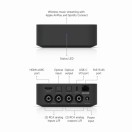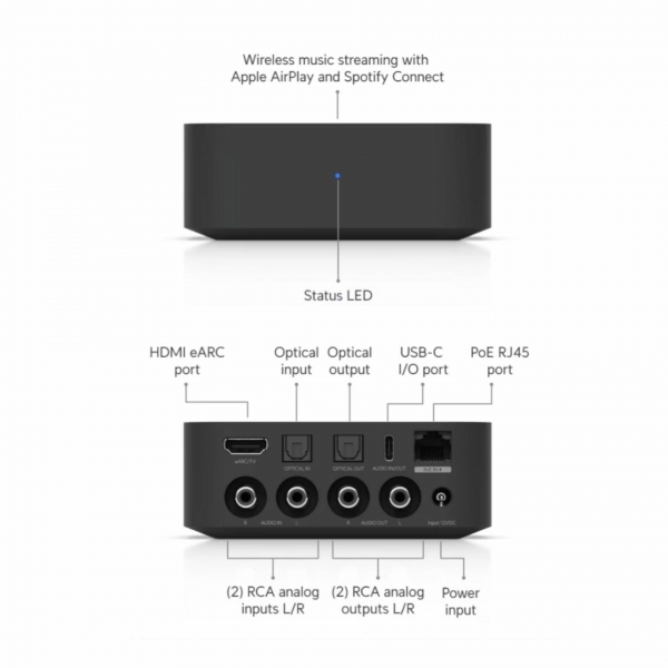 Podpira več priljubljenih pretočnih storitev in omogoča povezavo prek analognih, optičnih, HDMI eARC ter USB TipC vmesnikov. Omrežna povezava je mogoča prek Ethernet ali WiFi povezave, napajanje pa prek PoE ali priloženega 12 V DC napajalnika. Zaradi kompaktne zasnove je primeren za namestitev na mizo v poslovnih in komercialnih okoljih.