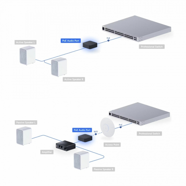 Ubiquiti Audio Port UPL-Port-B je digitalni avdio predvajalnik za profesionalne avdio instalacije, kjer je potrebna razširljiva večconska postavitev. Naprava omogoča mono ali stereo predvajanje v PCM formatu ter upravljanje do 32 PowerAmp in PoE Audio Port enot znotraj ene cone.